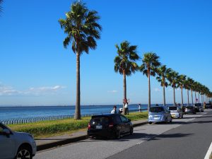 ヤシの木が並ぶ直線道路は台風一過の青空の背景も手伝って、ちょっとしたカルフォルニアの雰囲気?