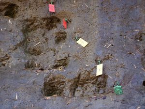 地層はこんな感じです。わかりにくいですが赤、黄、青の目印が貼られていました。