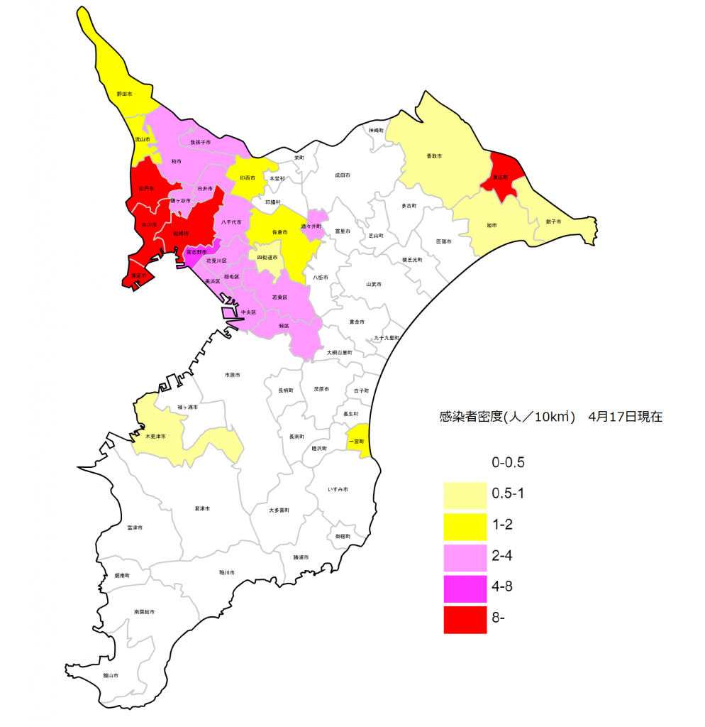 予想通り、人口密度が高く東京にも近い県西部の東葛、京葉地区の感染者密度が高い。